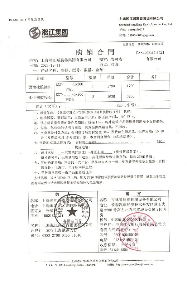 上海淞江减震器集团有限公司官方网站为您介绍:【一汽红旗繁荣工厂】冲压车间橡胶接头合同信息,上海淞江集团为众多汽车工厂冲压车间液压系统提供高品质橡胶接头,安全可靠深度用户信赖,以下是详细介绍。