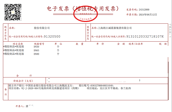 【苏州湾恒力环企中心项目】橡胶接头发票